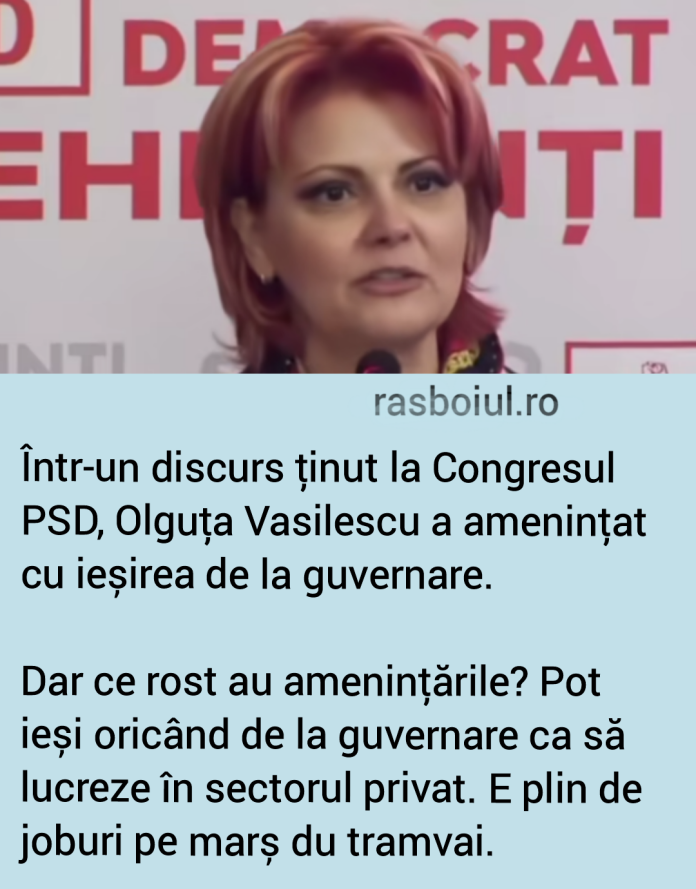 Olguța Vasilescu a amenințat la Congresul PSD că iese de la guvernare. Nu e o tragedie, poate se reangajează în sectorul privat, că tot e plin de joburi pe marș du tramvai.