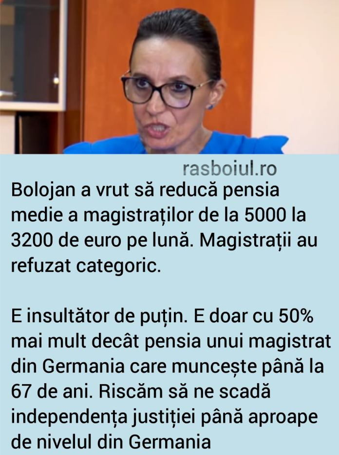 Bolojan a vrut să reducă pensia medie a magistraţilor de la 5000 la 3200 de euro pe lună. 3200 de euro pe lună fiind o pensie cu 50% mai mare decât a unui magistrat din Germania care se pensii eaza la 67 de ani. Reprezentaţii lor au refuzat categoric.